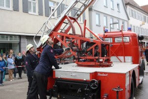 Als nächstes Fahrzeug fuhr die Magirus Drehleiter DL 25, welche bis 2002 in der Abt. Jesingen im Einsatzdienst war und heute auch im Feuerwehrmuseum steht, in die Markstraße. VFH-Vorstand Helmut Eiting erläuterte den Zuschauern, dass bis zur Beschaffung dieser hydraulisch betriebenen Drehleiter Magirus DL 25, im Jahre 1961, für die Feuerwehr Abteilung Kirchheim Stadtmitte, diese das im Jahre 1937 beschaffte Fahrzeug mit einer aufgebauten Holzleiter im Einsatz hatte. Dieser auf dem Magirus Fahrgestell aufgebaute Holzleiterpark war der Leiterpark der für die Feuerwehr Kirchheim 1908 beschafften Holzschiebeleiter (ähnlich der Holzmadener Holzleiter). Die Stadtverwaltung finanzierte bei dieser Beschaffung, in 1937, nur das Transportfahrzeug und keinen neuen Leiterpark. Die Jesinger Feuerwehrmänner konnten nun zeigen, dass diese hydraulisch betriebene Drehleiter wesentlich schneller in Stellung gebracht werden kann und auch eine höhere Einsatzhöhe bietet.