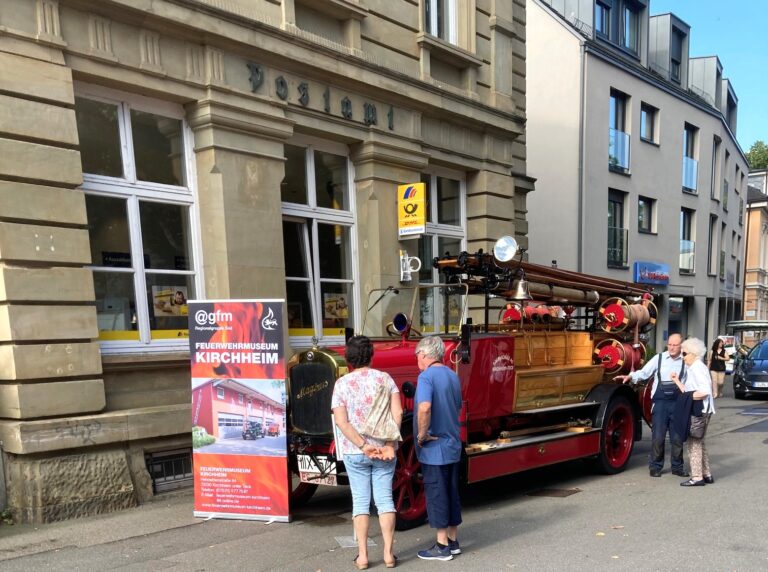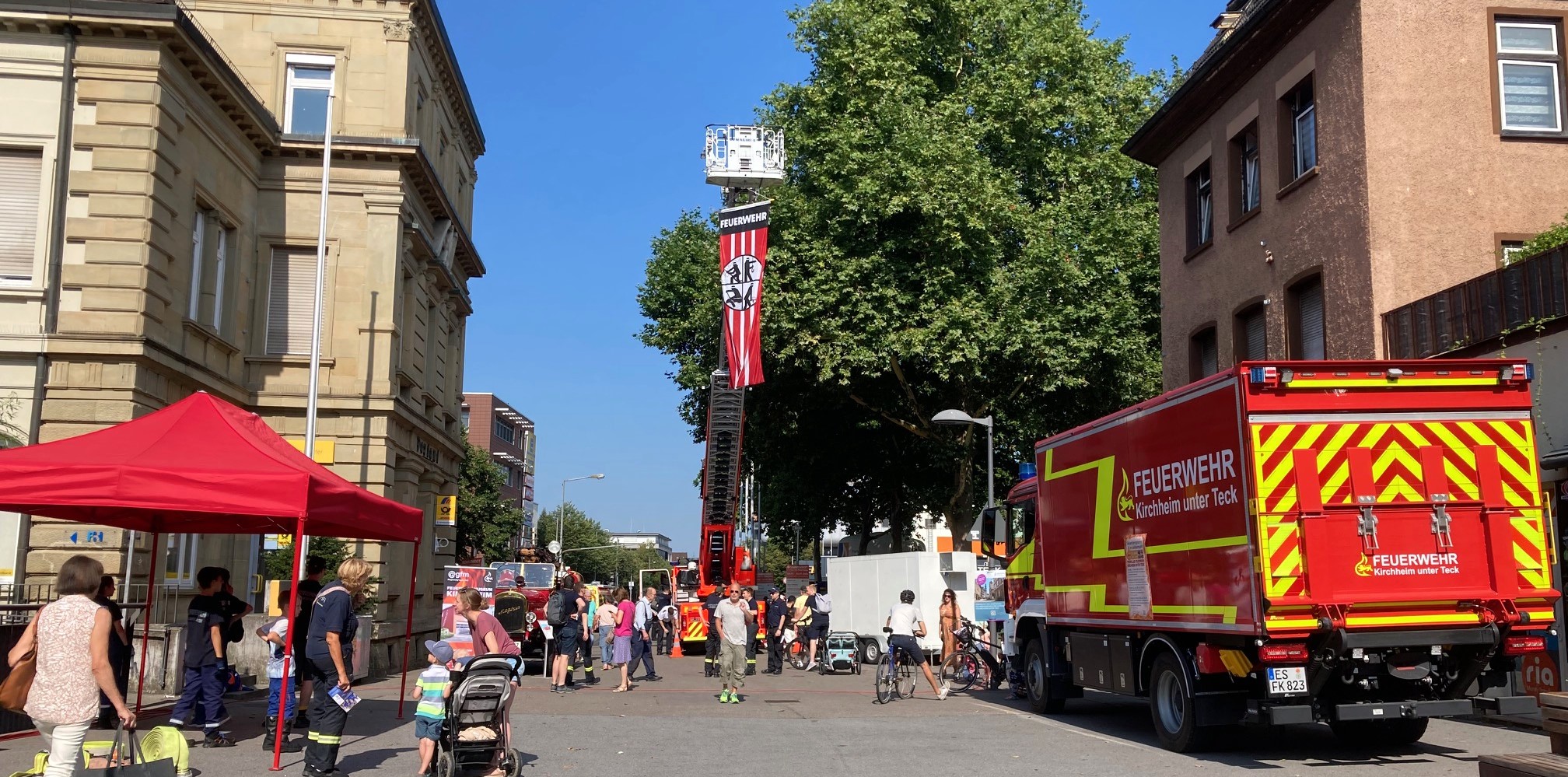 Am Samstag den 20. Juli waren wir mit unserer Magirus Kraftfahrspritze KS 20 Baujahr 1923 sowie der Drehleiter Mercedes / Magirus LDL 17 Baujahr 1941auf dem Kirchheimer Postplatz. Dies war die dritte Veranstaltung im Jubiläumsjahr der Kirchheimer Feuerwehr. Im Mittelpunkt stand der vorbeugende Brandschutz. Wir haben daher an unserem Stand Historische Feuerlöscher, Löscheimer, Küberlspritzen und einen Hydrantenwgagen ausgestellt. Neben unseren historischen Fahrzeugen konnten auch die aktuellen Löschfahrzeuge besichtigt werden. An einem Feuerlöschtrainer konnten die Besucher mit Fachkundiger Anleitung verschieden Feuerlöscher anwenden und sich über Heimrauchmelder Informieren. Für die Kinder hatte die Jugendfeuerwehr ein Spritzenhaus aufgebaut. Auch an unserem Stand war bei Sommerlichen Temperaturen die Kübelspritze im regen Einsatz.